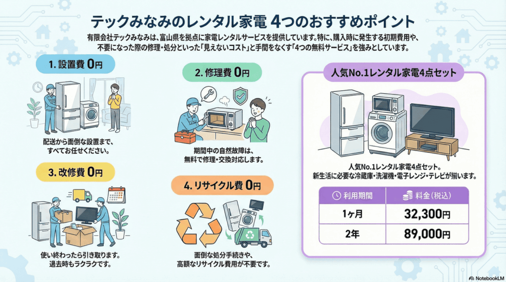 3. テックみなみのレンタルが選ばれる「4つの無料」 ✨